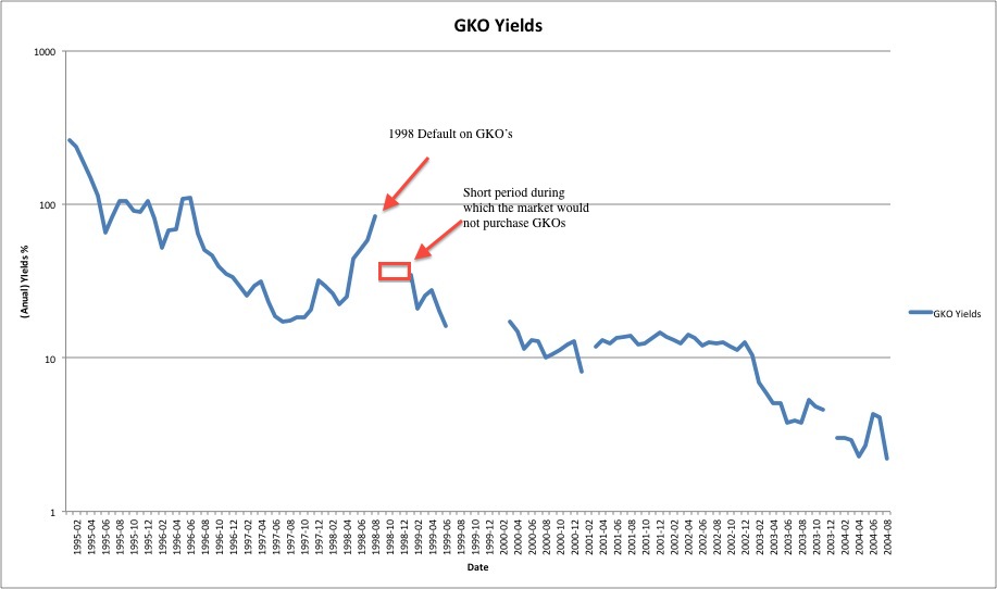 This chart shows the yields (on an annually adjusted basis) of Russian short-term, ruble-denominated bonds, called GKO's. During the mid-90s, foreign investors poured money into GKO's driving yields down from over 100% in 1995 to as low as 17.2% in early 1997. In 1998, when foreign investors realized the dire fiscal position of the Russian Federation, they started to repatriate their assets, driving the GKO yield up to new highs. This chart also shows how quickly the Russian government was able to issue new GKO's after the 1998 default, and at lower yields! Yields on these new GKO’s started at 17% and by 2004 dropped to only 2.4%, reflecting foreign investors perception of almost no risk in these bonds. In 2004, the Russian government stopped issuing GKO's because it no longer needed to borrow money (due to its large fiscal surplus).